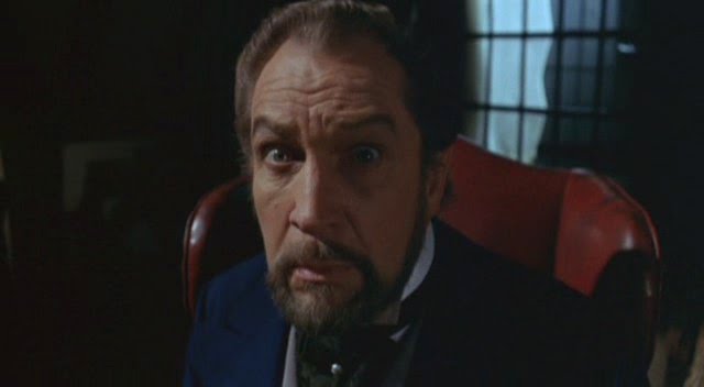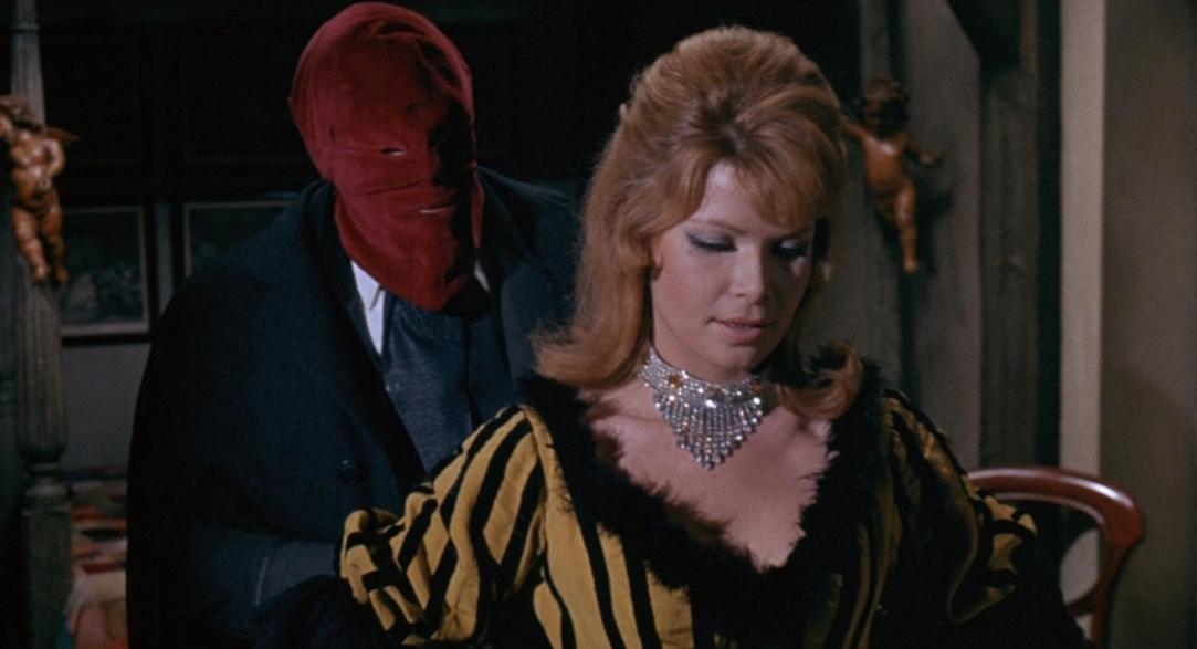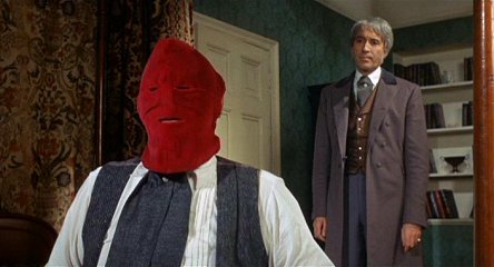 History: Sir Edward Markham hasn't had the best of days. During a disastrous visit to an African village, his brother Julian accidentally (his words. This IS Vincent Price we're talking about) murdered a boy there, and the chief thought Edward did it. For that, the poor man's face went heavily disfigured. Enraged at his predicament, Edward has a witch doctor help him fake his death so that he can rise from the grave and terrorize Julian's associates, concealing himself under a red hood.